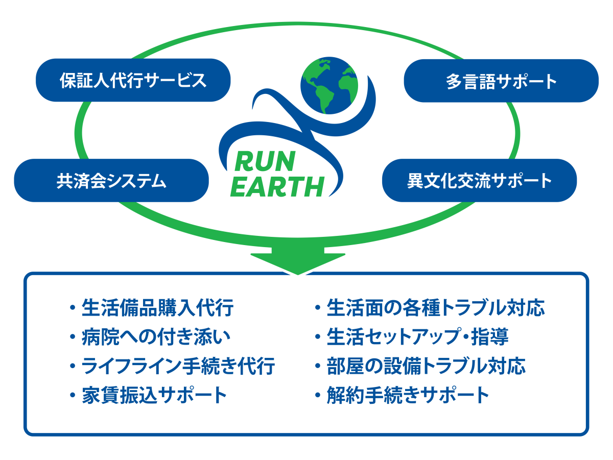 ランアースは、日本で働く外国籍の方への入国、日本での生活、在留カード手続き等の支援フォローを行って居ります。